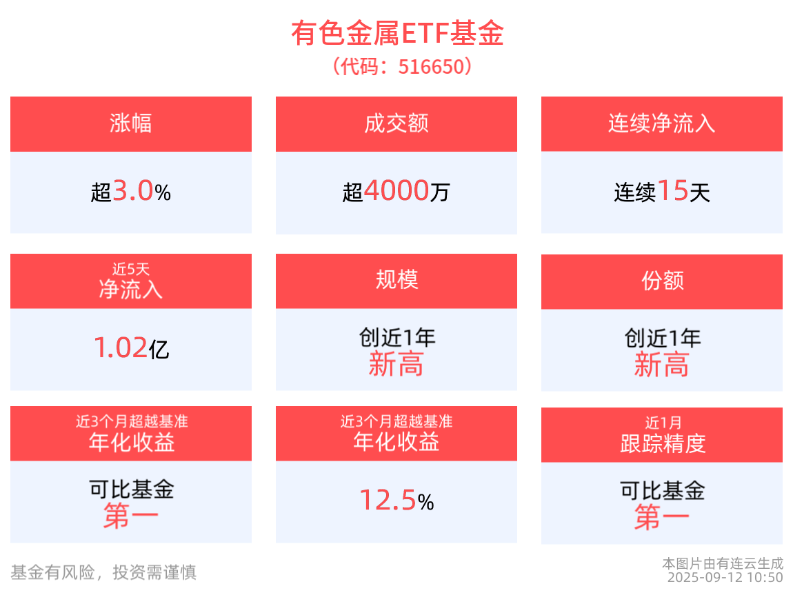 9月12日 ,受美联储降息催化,金银铜价格盘中走强,细分有色指数强势上涨2.93%,截至10:50,有色金属ETF基金(516650)上涨3.06%,其持仓股云南铜业、北方铜业双双涨停,中孚实业涨9.66%,兴业银锡、江西铜业等个股跟涨,最新价报1.52元,净值创近4年新高。