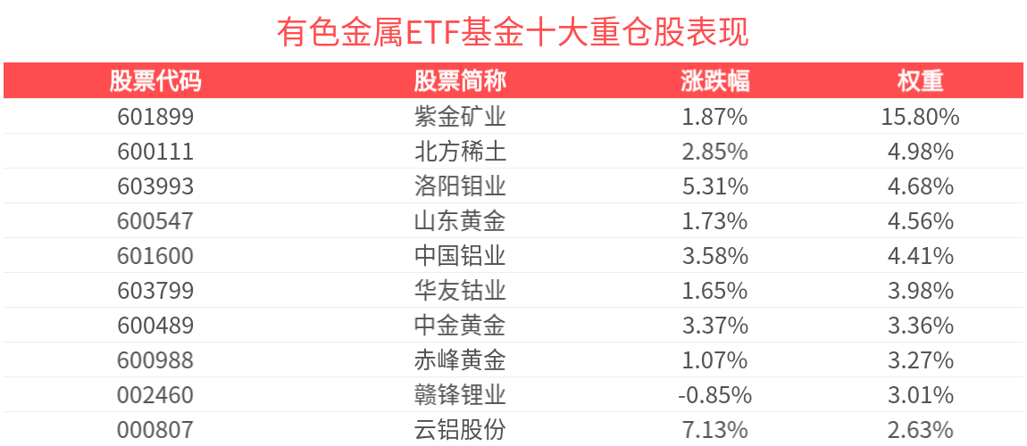 有色金属ETF基金紧密跟踪中证细分有色金属产业主题指数,截至2025年8月29日,指数前十大权重股分别为紫金矿业(601899)、北方稀土(600111)、洛阳钼业(603993)、华友钴业(603799)、中国铝业(601600)、山东黄金(600547)、中金黄金(600489)、天齐锂业(002466)、赣锋锂业(002460)、中国稀土(000831),前十大权重股合计占比51.86%。